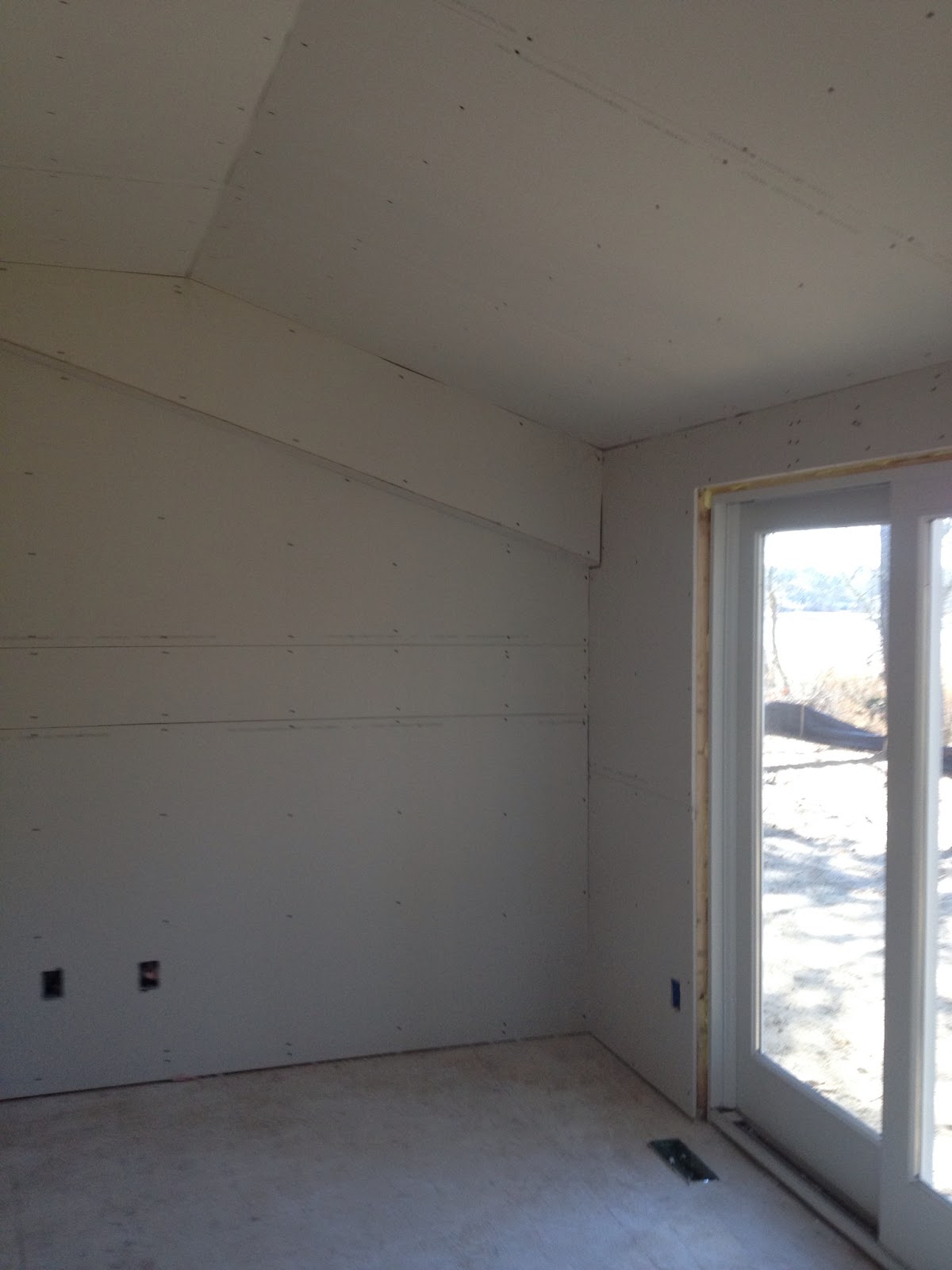 In no time the walls were up.  This shot is from the kitchen looking out at the view and the fireplace.  The dining area is to the right by the window.  Cannot wait for the first party!  I am shooting for a Memorial Day celebration similar to what they do on This Old House, all the contractors and friends.  Put it on your calendars.